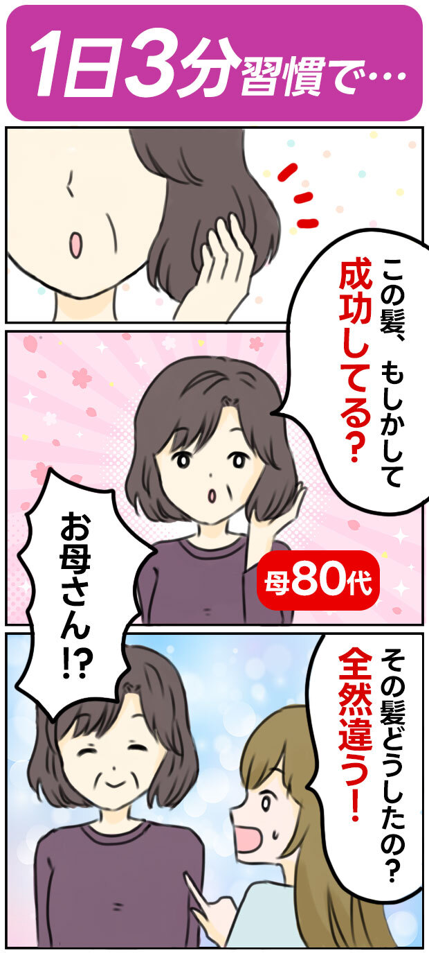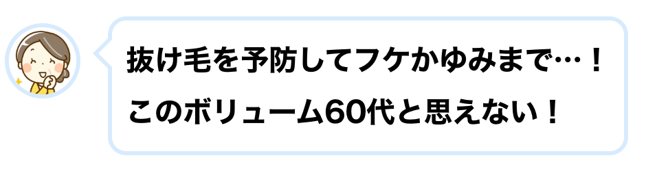 「その年齢で、すごいボリュームね!」と周りの人から褒められるので、ヘアセットも楽しくなりました。いつまでも若々しくいられるように対策を続けていきたいです。
